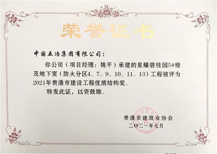 星耀碧桂園5#及地下室工程—2021年貴港市建設(shè)工程優(yōu)質(zhì)結(jié)構(gòu)獎(jiǎng)