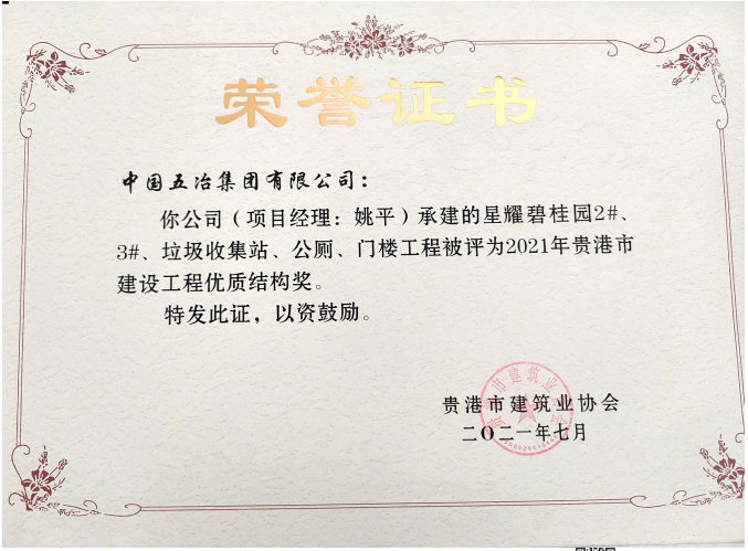 星耀碧桂園2#、3#、垃圾收集站、公廁、門(mén)樓工程—2021年貴港市建設(shè)工程優(yōu)質(zhì)結(jié)構(gòu)獎(jiǎng)