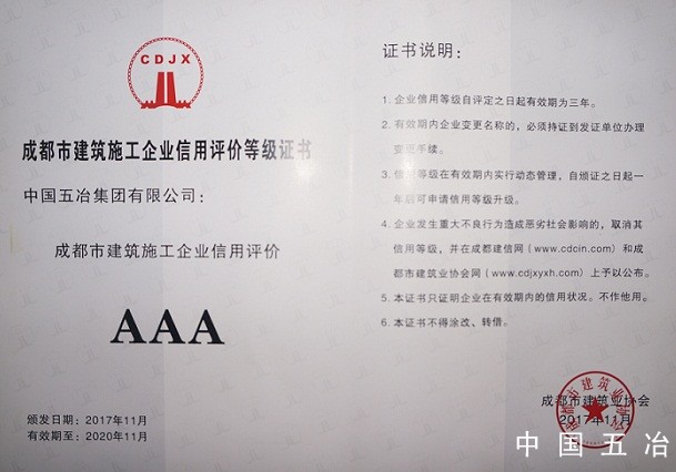 成都市建筑施工企業(yè)信用評價AAA等級證書