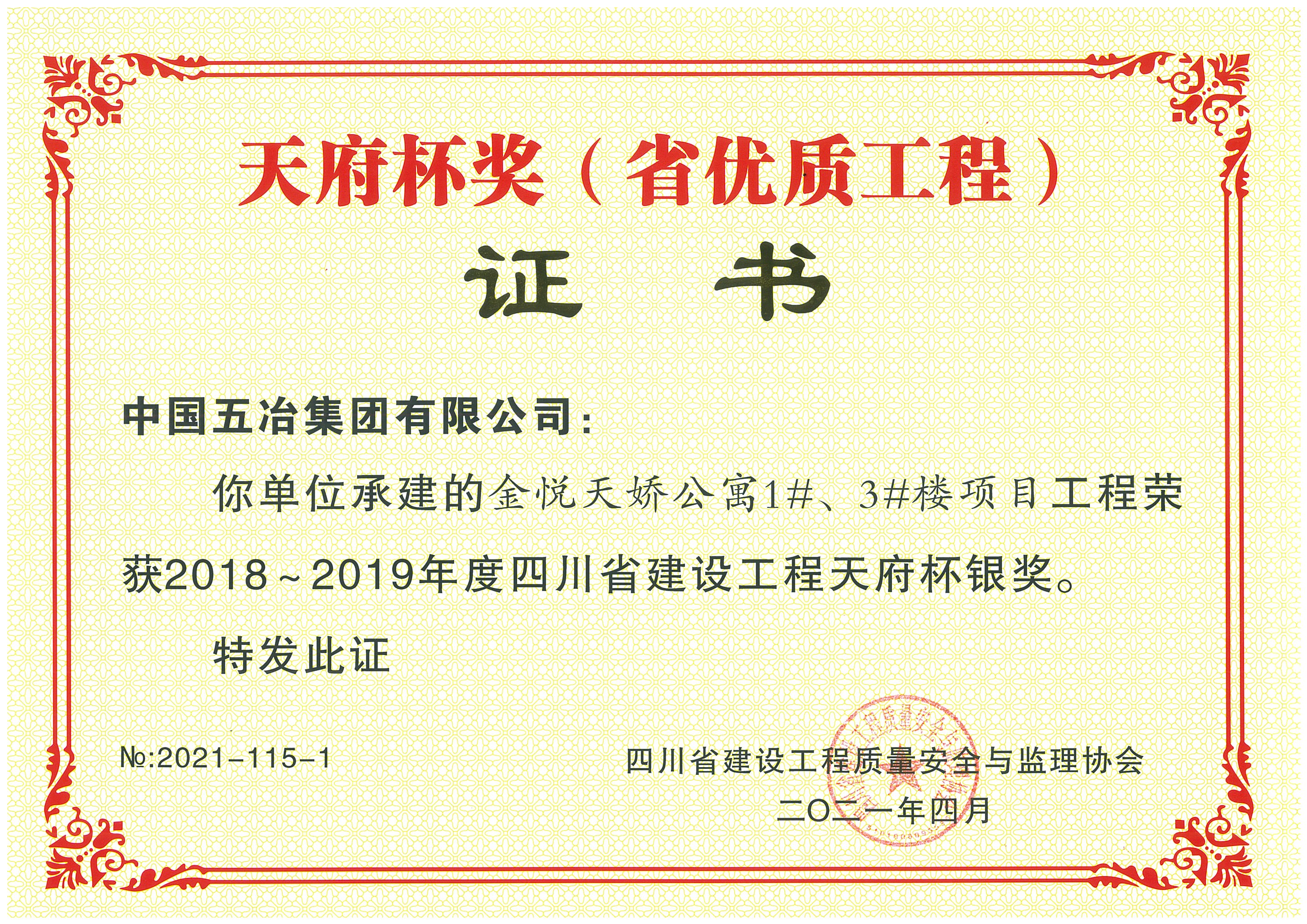 金悅天嬌公寓1#、3#樓項目-2018-2019年度四川省天府杯銀獎