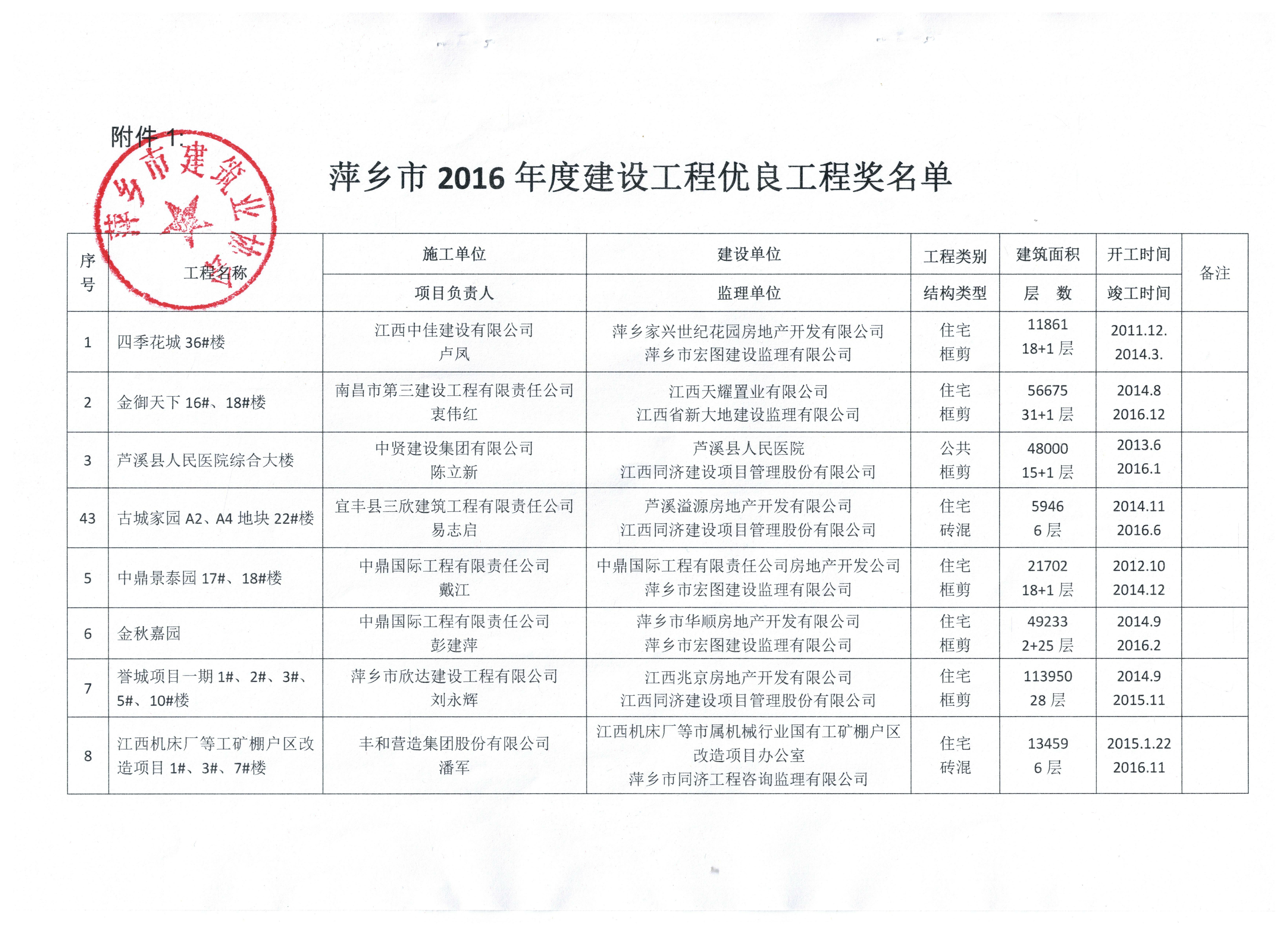匯恒小區1#-8#樓及地下室工程榮獲2016年度萍鄉市建設工程優良結構工程獎