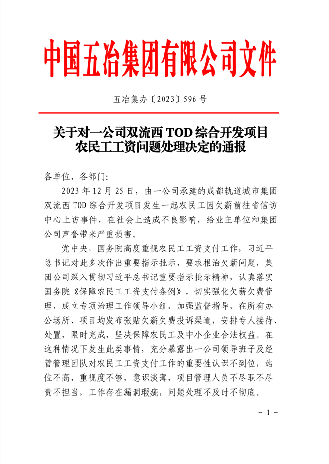 近日,由一公司承建的雙流西TOD綜合開發(fā)項(xiàng)目發(fā)生一起5名分包工人因欠薪前往省信訪中心上訪事件,在社會上造成了不良影響,給業(yè)主單位和公司聲譽(yù)帶來嚴(yán)重?fù)p害,集團(tuán)公司高度重視,對相關(guān)責(zé)任主體嚴(yán)厲處罰,充分體現(xiàn)了五冶集團(tuán)對欠薪欠費(fèi)的高度重視和對工作不嚴(yán)不細(xì)、不盡責(zé)不擔(dān)當(dāng)?shù)牧闳萑虘B(tài)度。